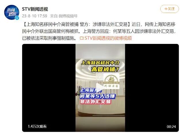 8月10日,“STV新闻透视”媒体以“上海知名移民中介高管被捕 警方:涉嫌非法外汇交易”为题,报道了相关情况。