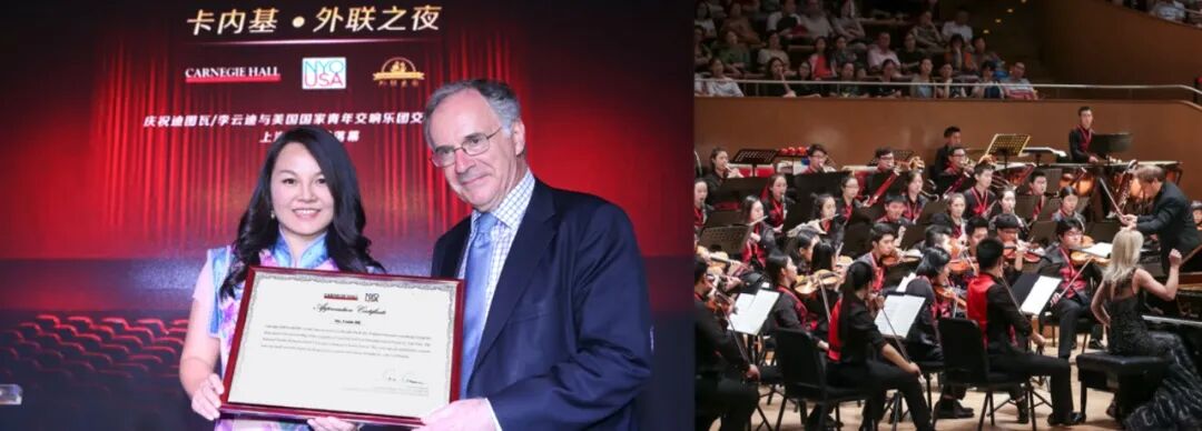 一张图片显示,2017年,在卡内基音乐厅的支持下,何梅创建了中华青少年交响乐团(NYO-China),为中国优秀的音乐学子提供音乐指导和演出机会。