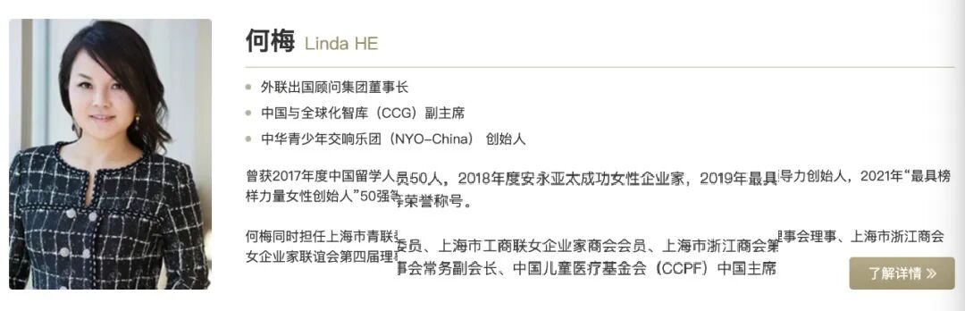 据该网站介绍,该公司负责人何梅有三个头衔:外联出国顾问集团董事长、中国与全球化智库(CCG)副主席、中华青少年交响乐团(NYO-China)创始人。还曾获得多个奖项及荣誉称号。↓↓↓