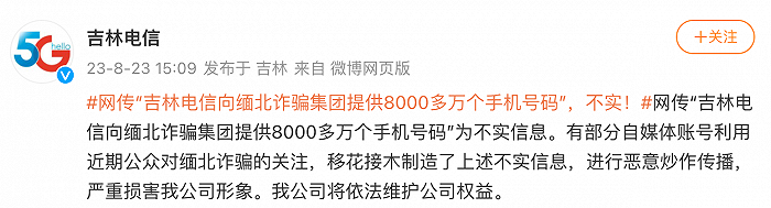 据澎湃新闻,央视网综合报道,8月23日,针对网络传言“吉林电信向缅北诈骗集团提供8000多万个手机号码”,吉林电信在微博上澄清此为“不实信息”。