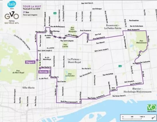 周五晚上举行的活动叫Tour La Nuit。车手们会从Parc Jeanne Mance出发,先骑到Parc Maisonneuve,再到Saint-Catherine,经Reneo-Levesque回到George-Etienne纪念碑。