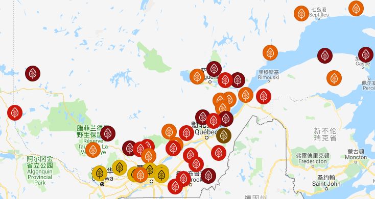 每年9月中旬起,不管加拿大是否成功入秋,魁省旅游局都会开始收集全省范围内的枫叶变色数据,并根据数据绘成枫叶变色指数地图,每周更新。