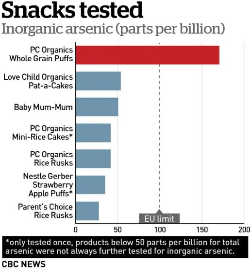 CBC在卡尔加里、多伦多、蒙特利尔地区购买了大部分由大米制成,50包、7种不同品牌的婴儿米糊和7种不同品牌的婴儿零食进行砷含量检测。