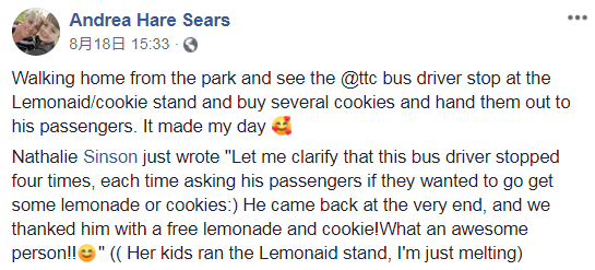 摊主Nathalie Sinson看到这个帖子后,留言补充说:“我来说明,这位司机在我们的摊位前停了四次,每次都问乘客想要点什么,然后就自己买柠檬水或曲奇饼分给他们。”“这位司机在下班后又来到我们的摊位上,我们为了向他表示谢意,免费送了他一杯柠檬水和曲奇!”“这对孩子们来说也是很棒的经历,他们很开心,因为自己能赚到钱了。这位司机真是太棒了,每个人都觉得他很甜!”看到这个帖子的网友都留言说:“这位司机太暖了!TTC(多伦多公交公司)应该由他来代言!”