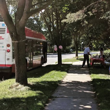 Sears在Highland Creek从公园走回家的路上,碰巧看到一辆TTC巴士停在卖柠檬水和曲奇饼摊位前。她原以为这个公交车只是到站停车,但没想到司机走下车在小摊上买了饼干。这个躲在树荫下的小摊是由一位妈妈带着小孩们经营的。为了引人注目,他们还在摊位前的树干上系上了白色和粉色的气球。这位司机买了很多曲奇饼,然后回到车上。当Sears走到巴士边上时,正好看到司机把曲奇饼分给他的乘客。小摊上的孩子们兴奋地跑来跑去特别开心。