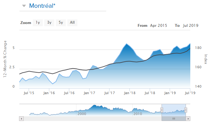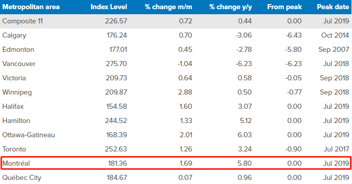 从城市来看,在全国11个主要大都市中,蒙特利尔二手房价月涨幅1.69%,排全国第三;年涨幅5.8%,排全国第二。不管是按月还是按年来看,温哥华是唯一出现房价指数下跌的城市。7月二手房价跌幅为1%,是连续第12个月没有出现上涨的情况。按年算则下跌了6.2%。