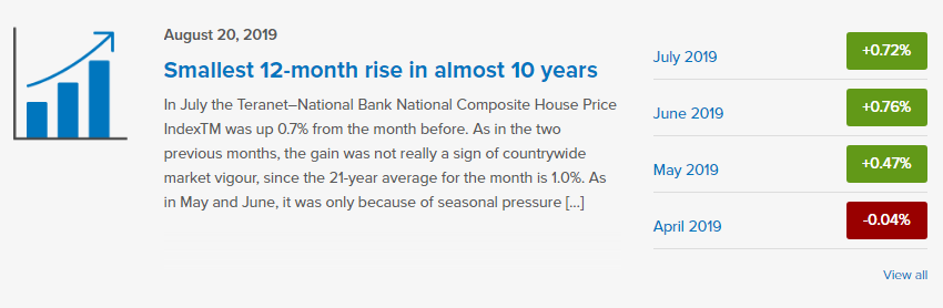 7月的数据按月涨幅来看,低于过去21年同月的平均涨幅。按年涨幅来看只有0.4%,是自2009年11月以来最低的数据。整体来看,二手房价从5月开始上涨。5月增加0.47%,6月涨幅0.76%,7月上涨0.72%。过去21年7月的房价平均涨幅为1%。国家银行资深经济师Marc Pinsonneault表示,7月只是小幅上涨,这意味着房市并不强劲且7月的数据低于传统上每年这个时间的房价涨幅。如果加上季节性因素进行考量,房价从5月开始持续下跌。5月减少0.4%,6月下降0.5%,7月下跌0.1%。
