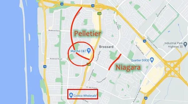 初步调查显示,肇事司机分别在Niagara Avenue街和Boul Pelletier街先后撞倒了一名在自行车道上骑车的50多岁男子以及一名40多岁的女性行人。两人均受重伤。当晚,女伤者在医院被宣布死亡。目前,男伤者尚未脱离危险。从图中看,肇事司机的逃逸路线正是华人超市C&T的南面大街。