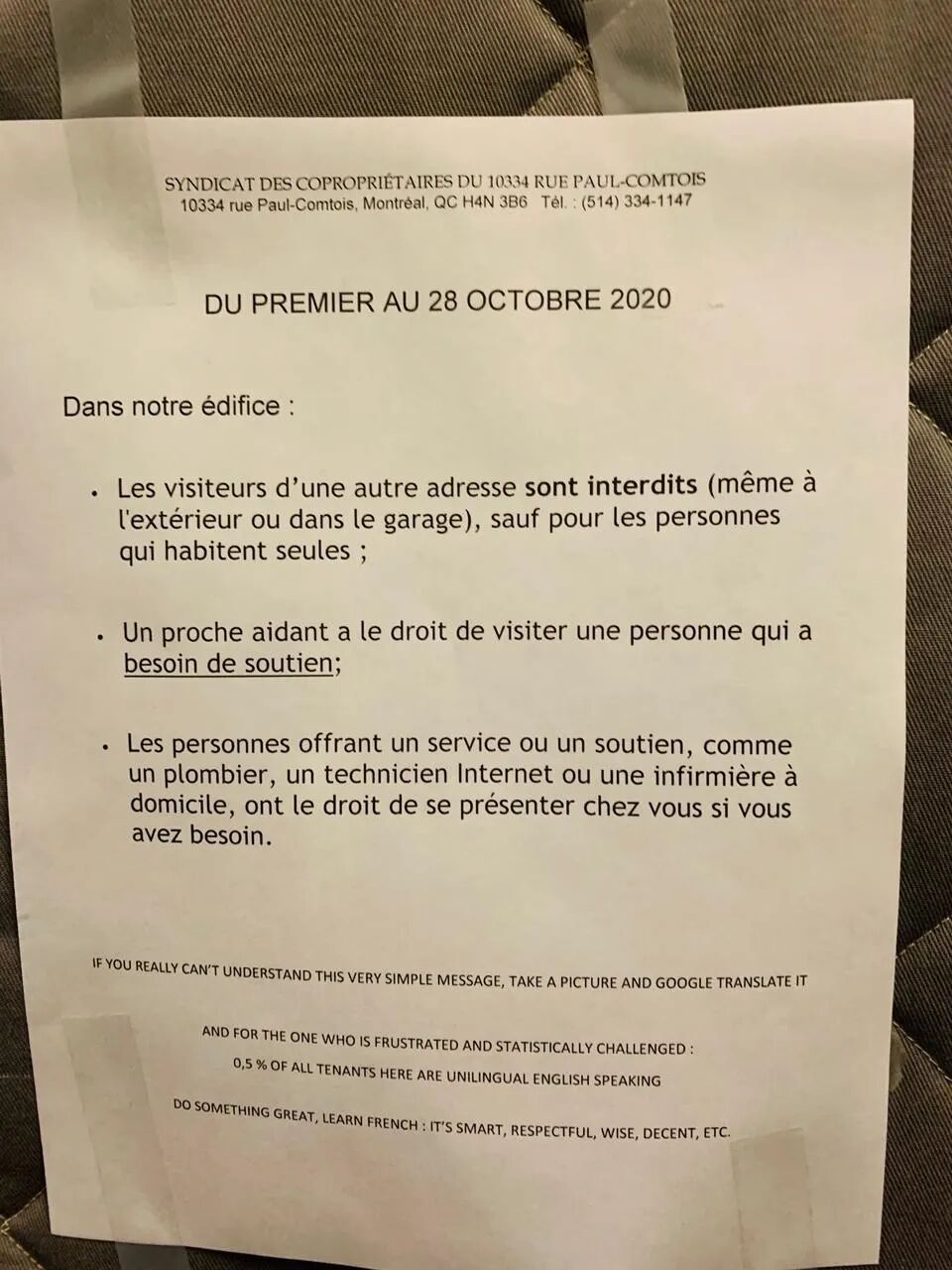 蒙特利尔一名女子最近遇见了一件让她十分气愤的事情。据媒体CJAD 800报道:这名女子名叫Sophie Romas,她的父母居住在蒙特利尔Ahuntsic区的一栋公寓里,此前,公寓内贴了一张通知,是关于政府10月1日至10月28日的卫生防疫措施的。最初,该通知仅以法语发布,Romas说她的父母要求张贴英文版本。