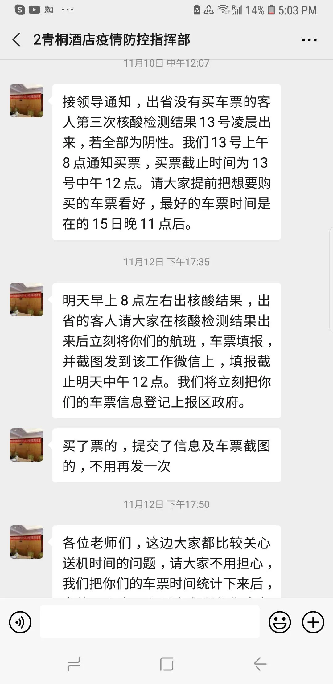 指挥部终于确认了这事,留在青桐的全是密接,除了上面的3个病例,其他全是阴性。(群里小伙伴说我们这叫”三阳开泰“。)因为我们密接人数多于非密接,所以就转移了非密接。之后嘛,也就是大家各种恐慌、讨论、猜测过后,还是该吃吃,该睡睡,该点外卖的就点外卖。身体是革命的本钱。关键时刻还是靠自身抵抗力。11月5日,密接者加了一次核酸检测(跟之后7日的一次加在一起一共133元),发了一张密接的通知书,上面有个青桐医务组建的群二维码。进了群之后,emmm……看到有人正在质疑医务组,要医务组搞搞清楚到底到底谁才是密接,外加辱骂其他群成员。(那个群的画风就是几个中老年在吐槽房价太贵,吃的太烂,年纪大也没得到应有的照顾。这群里”大爷“,连工作人员都得罪不起。)好在这次检测跟之后7日的都是全员阴性。11月12日,隔离结束前最后一次核酸外加血清。之前一直看到不少例子,隔离时间过半,才被查出阳性的,所以大家心情还是挺紧张的。下午一声电话铃响,差点没把我吓死,却原来是酒店工作人员问要不要发票。13日早上出结果,全员阴性。按照指挥部的要求,买机票,买完汇报上去。