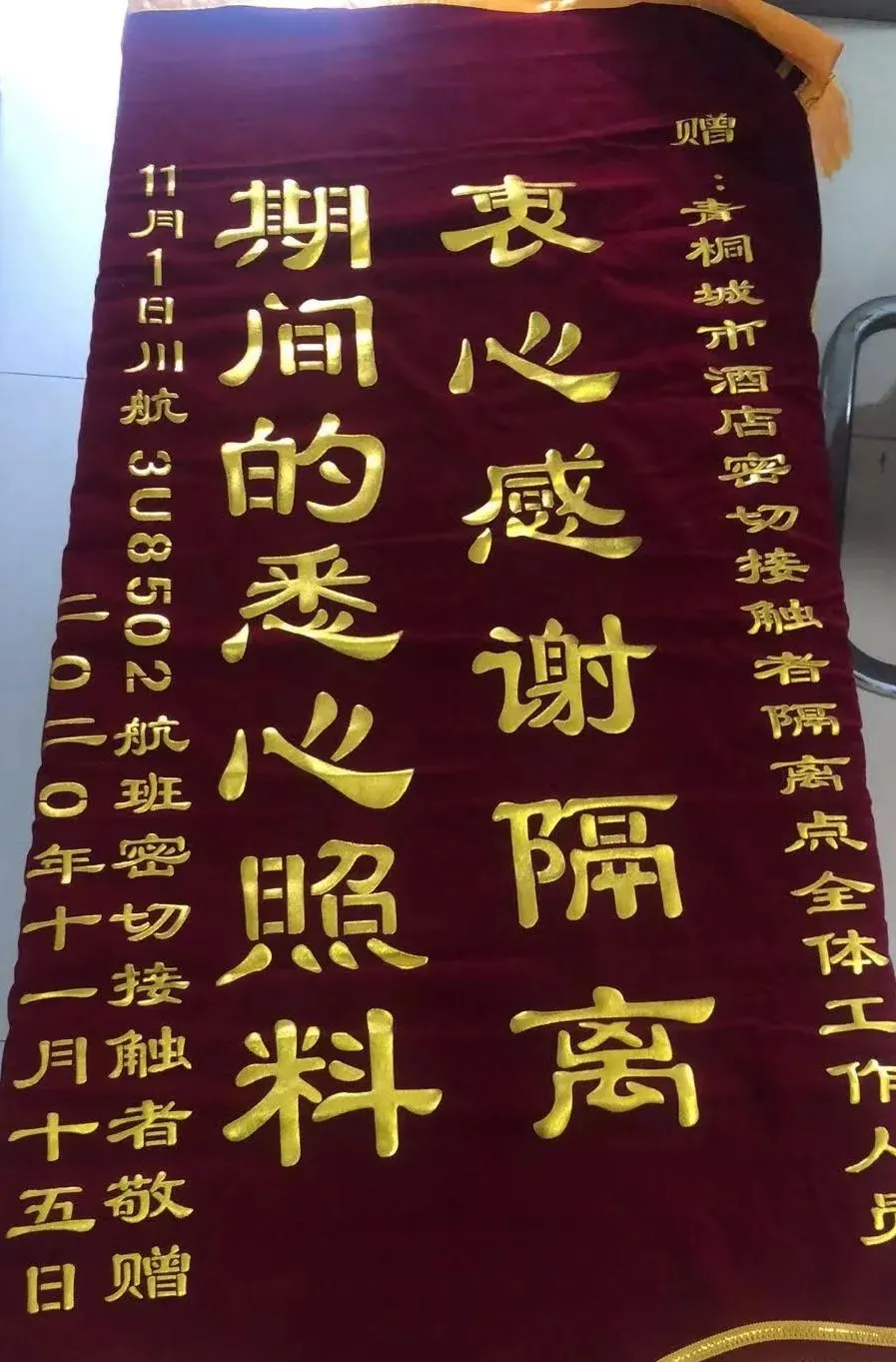 14日,邮寄行李。自己联系快递公司,行李酒店帮忙拿下去。15日解除隔离前的最后一天,有人提出要买奶茶送工作人员,去询问具体工作人员人数,人家不肯说,表示感谢信就可以。我说,要不弄个锦旗。还是有人说锦旗太过了,送点吃的就好……总之,从送的东西到锦旗内容,每个人都说一句,过了很久也没个结论。最后,一山西妹子一锤定音:”致青桐酒店全体工作人员:衷心感谢隔离期间的悉心照料——11月1日川航3U8502航班密切接触者敬赠!”“想送的每个人出5元。” 就这样群里三十几个人,凑了一面最好最大的锦旗。