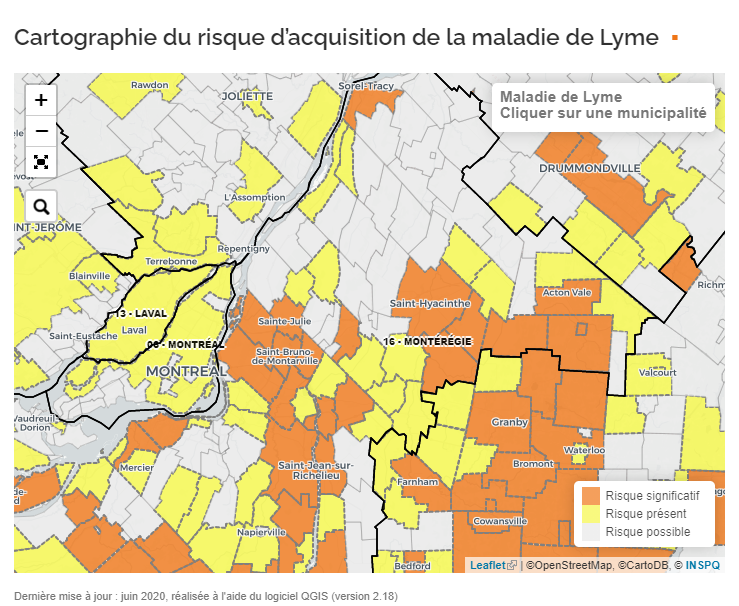 魁省公共卫生局警告,今夏被黑腿蜱虫咬伤而感染莱姆病的风险会大大增加。据悉这种蜱虫原本在魁省南部靠近美国边境的地带活跃。由于气候变化,全球变暖,这些蜱虫的繁殖区域正在一直向北移动,蒙特利尔岛也不能幸免。