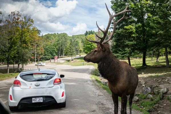 魁省野生动物园惊险一幕:野牛头被卡游客车窗,疯狂挣扎!