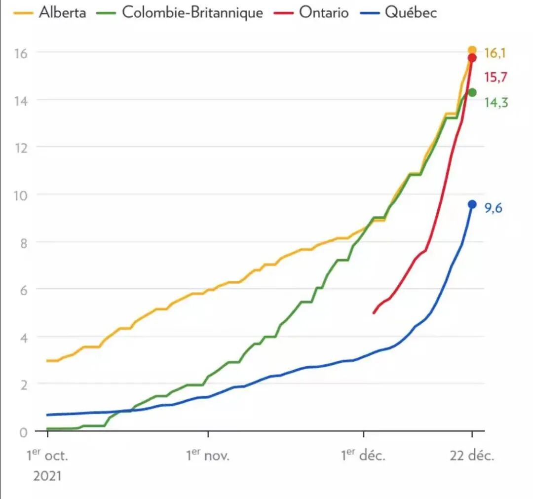 INSPQ表示,最近几天的数据表明,奥密克戎变种的发展充分利用了魁省12月初的流行病学形势——一方面,已接种疫苗的保护效力正在减弱,另一方面,第三剂加强针的接种覆盖率偏低且人际交往活动增加——这些都是该变种得以在魁省迅速蔓延的主要原因。INSPQ免疫学和病毒学教授兼研究员阿兰·勒马尔(Alain Lemarre)惊呼:“如此令人眼花缭乱、头晕目眩的传播方式及其所导致的病例暴增,均大大超乎我们的意料。奥密克戎变种在如此短的时间内就横扫全省,令人猝不及防。”截至12月22日,加拿大新冠疫苗接种数据跟踪网(covid19tracker.ca)更新显示,魁省每百人接种第三剂加强针的进展速度远低于阿尔伯塔省、BC省和安大略省。