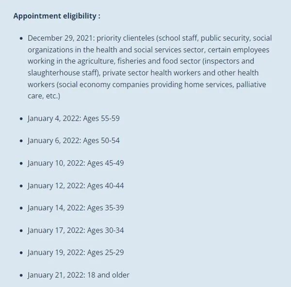 魁省卫生部长Christian Dubé刚刚召开新闻发布会。部长重申,“当前所报数字并非真实感染人数。真实数字非常高,具体多少我们不知道。现实情况是,感染者越来越多,而医院护理人员越来越少。”1. 在特定情况下,感染的医护人员和其他必须型工作人员(essential workers)将继续工作。措施细节将在未来几天内公布。部长强调“将衡量每一例具体情况再做决定”。部长说:“让确诊医护人员继续工作是没有办法的办法,我们别无选择。”2. 12月29日(明天)开始,一些特定领域的工作人员可以开始预约并注射第三针加强剂疫苗。该第三剂扩展群体包括:学校老师及员工、公共安全部门、卫生和社会服务部门及旗下社会组织、农渔食品部门检查员及屠宰场工作人员、私营部门卫生工作者及其他卫生工作者,提供家庭服务者等等。下图是最新公布的“魁省第三针预约时间表”(按年龄段)。部长预计“到2022年3 月,将为魁北克所有符合条件的人群打完第三针”。本周一,魁省省长Francois Legault在蒙特利尔奥林匹克体育场接种了他的第三剂新冠疫苗。Legault说:“第三剂疫苗非常重要,大家不要觉得接种完前两剂就可以高枕无忧,专家们说接种完前两剂对奥密克戎(Omicron)的保护率仅为30%,接种加强针后的保护率会上升到75%。”“但75%不是100%,”省长补充并强调,“减少接触依然非常重要。”他希望魁北克人新年期间减少聚会,以减缓医院负荷。“现在住院人数在不断上涨,医院已不堪重负。”魁省Sainte-Agathe医院急诊室医生Dr.Simon 表示,目前医院急诊情况很严重,“不光是住院人数增加,很多医护人员和护理人员都感染了。我所在的急诊室已有近20%的医生因确诊或密接而被隔离。”南岸Saint-Hubert的一家长期护理院(CHSLD)日前爆发疫情,截止目前已有近百人感染,两人死亡。CHSLD Marguerite-Rocheleau的疫情爆发自12月21日或22日,之后迅速蔓延——1个病例变6个,接着就变成12个,然后在几天内变成21个……截至昨日,全院59 名居民和39名工作人员检测结果呈阳性。该养老院负责机构Arbec Health Group的总裁保罗表示,目前公司管理层和员工都在拼命试图控制病毒的爆炸性传播。目前尚不清楚疫情是怎么在这家养老院中开始的……
