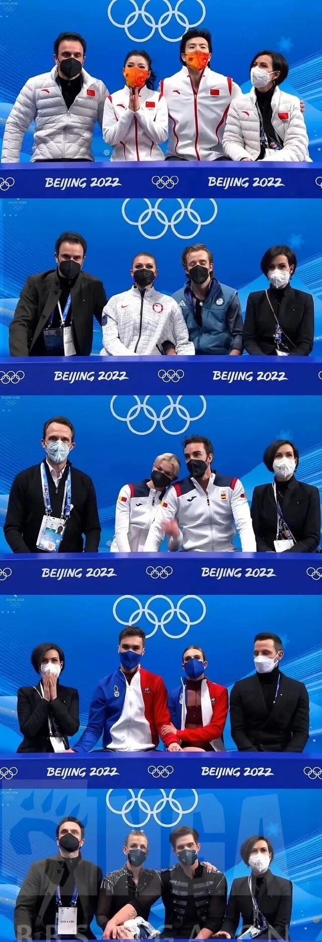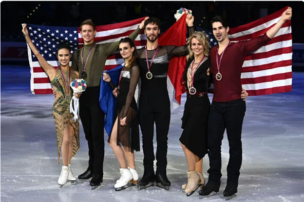 三对北京冬奥会冰上舞蹈选手都是在蒙特利尔的冰舞学校训练,从左至右为:第四名美国组合Madison Chock/Evan Bates,获得冠军的法国组合Papadakis /Cizeron,第三名的美国组合Madison Hubbell /Zachary Donohue (Photo:MARCO BERTORELLO/AFP via Getty Images)