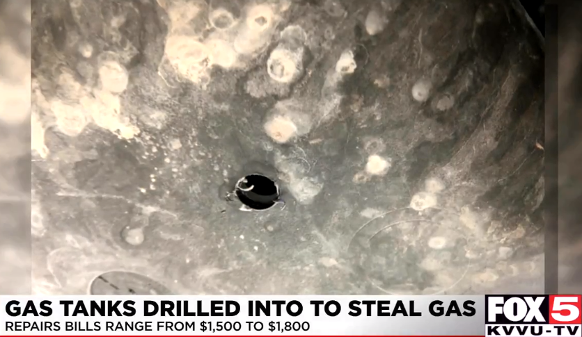 据报道,在北美,不少偷油贼会钻到车底下,给油箱钻个洞(上图),车主修理起来至少要$1500-$1800……简直……太缺德了!
