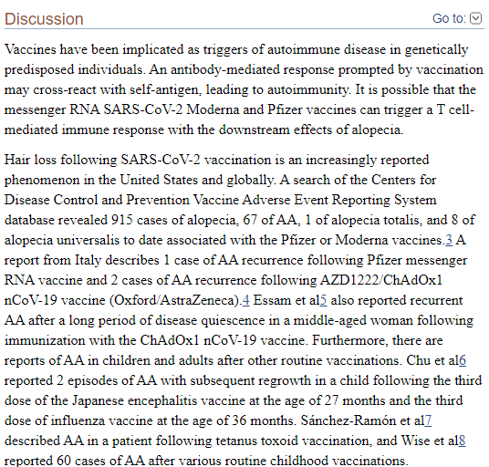 最后,哥伦比亚大学学者们得出的结论和意大利学者类似:“疫苗接种引起的抗体介导反应可能与自身抗原发生交叉反应,导致自身免疫问题。mRNA疫苗(Moderna和辉瑞)有可能触发T细胞介导的免疫反应,并具有脱发效应。”