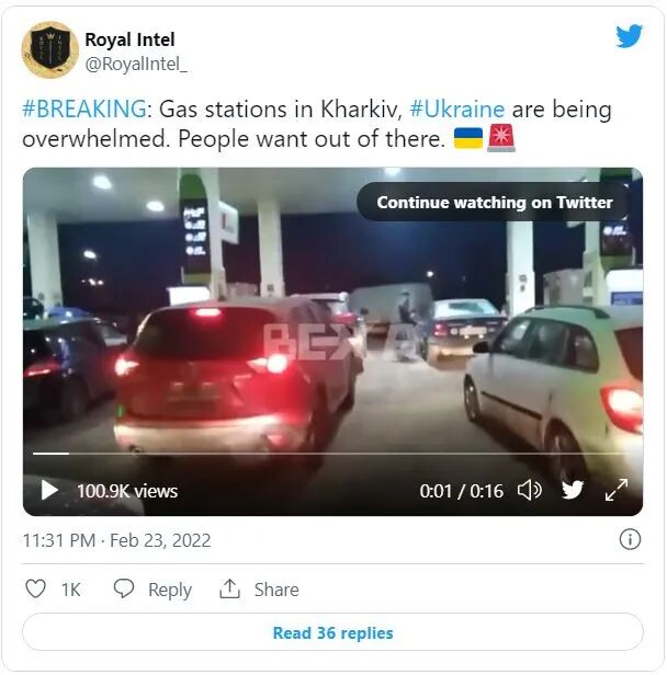 社群媒体显示,民众越来越恐慌,很多人已经躲进防空洞和地下室避难。电视画面显示,街上到处都是祈祷的人,成群结队,很多人抱在一起。基辅卫报记者哈丁(Luke Harding)在推特上说,人们在提款机前排起长队。加油站外挤满车潮。民众等待加油,只为离开基辅。