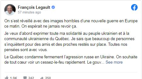 “我知道,很多人都在担心自己在乌克兰境内的亲朋好友,我的心与乌克兰人民同在。”“魁北克强烈谴责俄罗斯对乌克兰的侵略,我们真诚地希望尽快看到停火。我们将在这方面给予联邦政府充分合作。”“在未来几周和几个月内,魁北克将尽其所能欢迎乌克兰难民。我们也随时准备尽可能地提供人道主义物资援助。”“我们必须与我们的欧洲和美国盟友形成共同战线。我相信,我们将能够共同捍卫我们民主国家和我们社会的基本原则。”