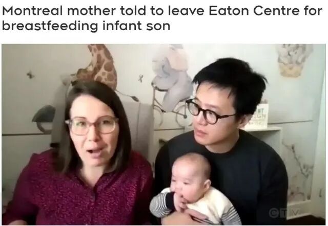 近日,一位正在蒙特利尔Eaton Center(伊顿中心)给宝宝喂奶的妈妈被保安驱赶,她对此感到非常震惊和尴尬,华裔爸爸对此也是气愤不已,他选择在媒体曝光此事。