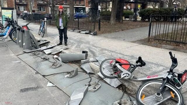 据目击者称,两名驾驶一辆大型皮卡车的醉酒男子,试图将车停在共享自行车Bixi站,结果,将其碾为一地碎渣……