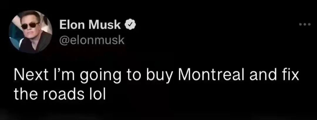 今天,蒙特利尔朋友圈被一条好消息刷屏,刚买完推特的世界首富马斯克,竟“打算买下整个蒙特利尔,然后修好所有的路……