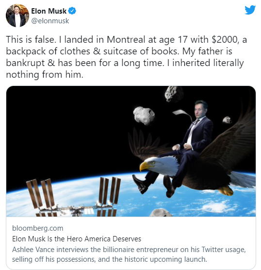 2020年7月,一位Twitter用户宣称“马斯克的爸爸有祖母绿宝石矿,他是个富二代却没有为促进人类发展而做出任何贡献……”马斯克回复称,自己才不是富二代,他17岁从南非搬到蒙特利尔时一无所有。