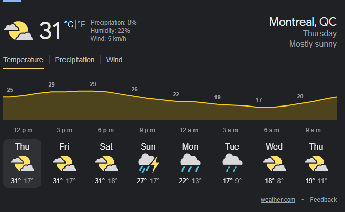 你感受到了么?今天开始,蒙特利尔开始连续5天的热浪天气,天天温度都在30度以上,本周六体感温度可能将达到33度,打破130年来的高温纪录。