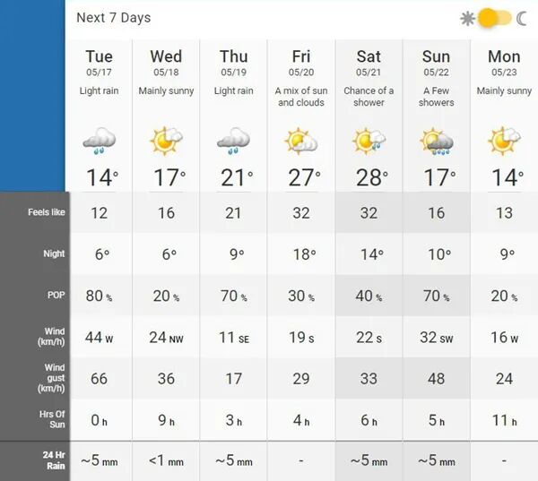 上周,蒙特利尔气温经一路攀爬至顶后终于迎来降雨,并将本周天气打回原形……据天气预报网站显示,周一至周四夜间最低温度将只有6-9℃。而周五气温将再次攀上30摄氏度。不过,周日会再次降雨,温度再次下滑。