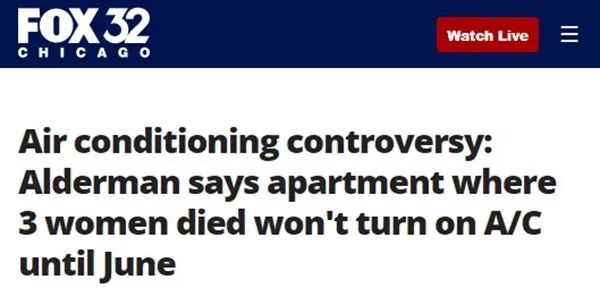 美中时间5月14日,三名女子被热死在芝加哥一栋没有空调的公寓楼中。一位市议员表示,该大楼的管理员说,无论天气有多热,他们在6月1日之前都不会打开空调……