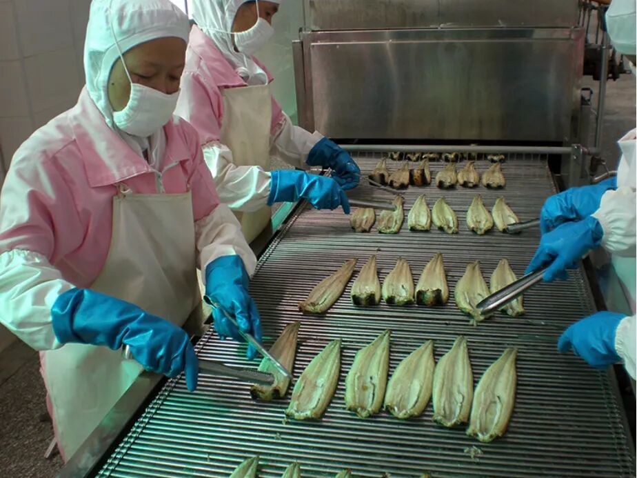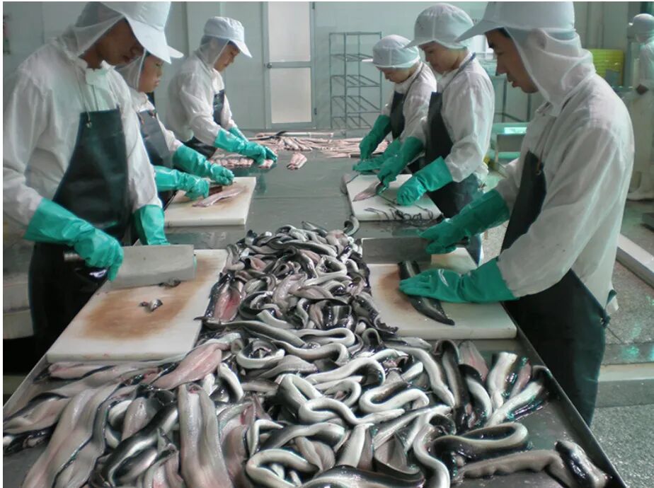 中国福州长乐太平洋食品厂(与AED同属一个集团),工人们正在处理成年鳗鱼,制备鳗鱼肉