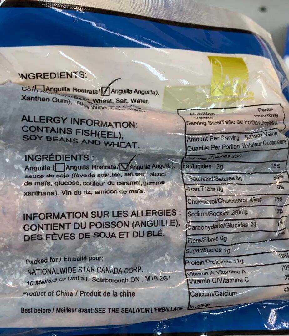 AED公司坚称,他们的鳗鱼就是在美国本地出产的(美加两国不像欧洲,当局对当地鳗鱼捕捞监管限制较少)。但蒙特利尔唐人街一家商店中的货品却啪啪打了AED公司的脸,在这家商店所售的AED牌鳗鱼包装上,标签上赫然印着“欧洲安圭拉鳗鱼”。