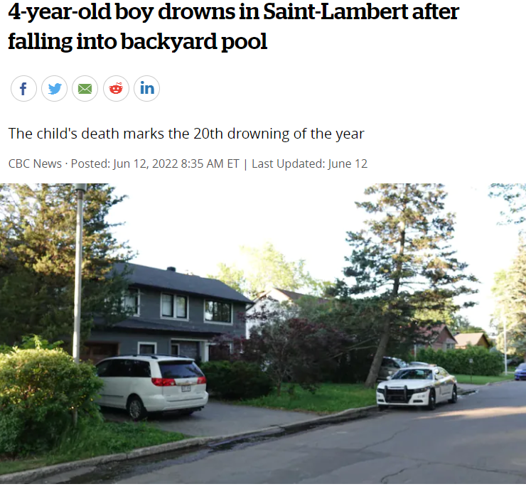 周六下午4点刚过,警方接到报警称“一名4岁男孩在自家泳池溺水”。救护车赶到南岸Saint-Lambert诺曼底大道出事人家。医护人员试图抢救这名小男孩儿,但不到一小时后,他在医院被宣布死亡。警方发言人弗朗索瓦·布歇(François Boucher)表示,这起死亡可能会被定性为意外,这家人安装了泳池防护栏,但不知道孩子是怎么进去的。“孩子在水边时,家长固然要保持警惕,但是,”弗朗索瓦强调说:“更重要的是,家长永远不要假设你的孩子会很听话,不要假设他们不会遇到危险。”加上这名小男孩儿,魁省入夏以来的溺亡事件已有20起。周日下午,一名五岁男孩在其位于Repentigny的家中跌入后院泳池……