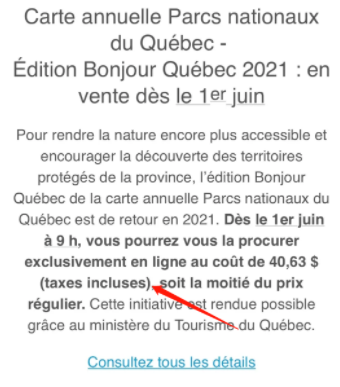 如果你跟小编一样在等魁省国家公园年票打5折的信息,那么答案恐怕要让你失望了——今年公园年票不打折!在过去两年的疫情期间,魁省为鼓励人们省内游,旅游部专门拨款使魁省国家公园门票打5折,含税仅需$40.63元。为啥呢?Sépaq(国家公园)发言人Simon Boivin解释道:“在魁省政府上一份预算中,我们没有得到旅游部在过去两年中授予的500万加元的补贴,因此我们也没钱再给各位5折买票的优惠了。”