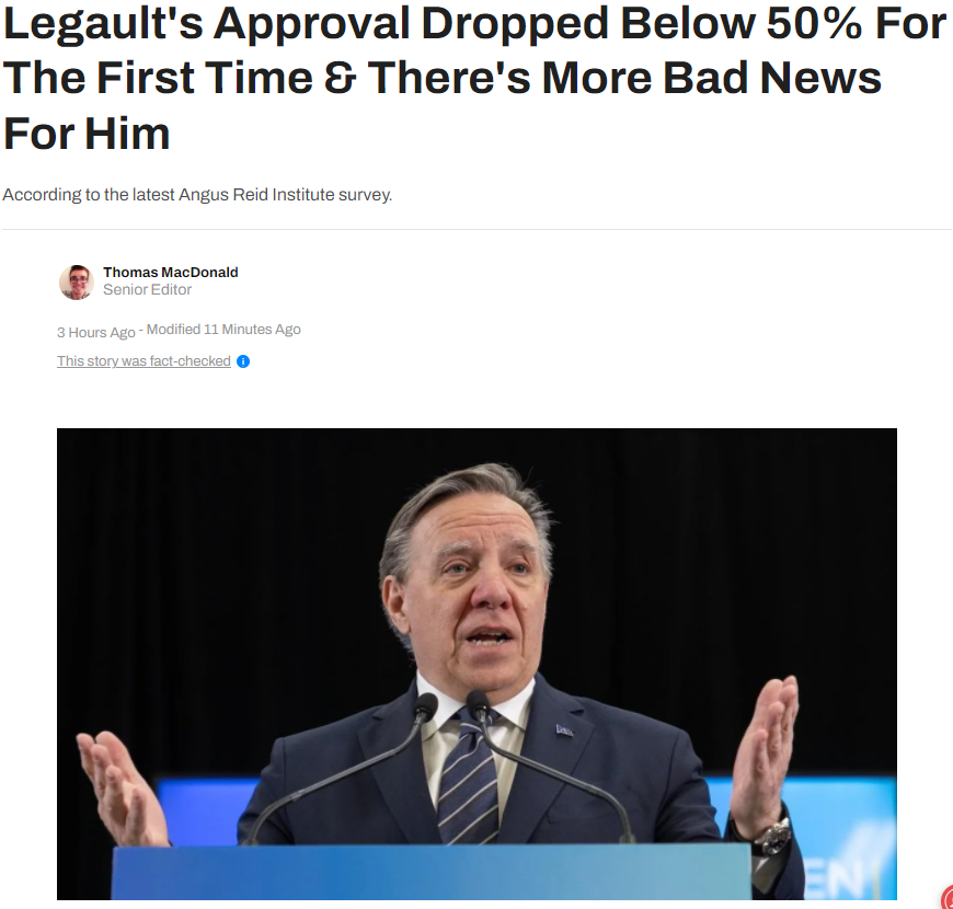 根据最新的Angus Reid Institute(ARI)民意调查显示:经过近四年的超高支持率,魁北克省省长弗朗索瓦·勒戈 ( François Legault ) 的支持率最近下滑至50%以下,这是史上首次。