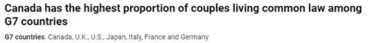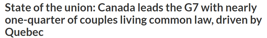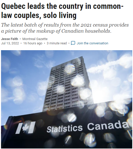 7月13日,加拿大统计局(StatCan)发布了新的2021年人口普查数据分析报告,结果显示魁北克是加拿大独居人口比例最高、选择同居不结婚比例最高的地区。就全加拿大而言,同居(Common-Law)成为越来越多加拿大人选择的结合方式——自1981 年以来增加了 447%。加拿大统计局人口中心主任洛朗·马特尔在周三的新闻发布会上说:“就 2021 年的同居伴侣比例而言,加拿大在 G7 国家中排名第一。”