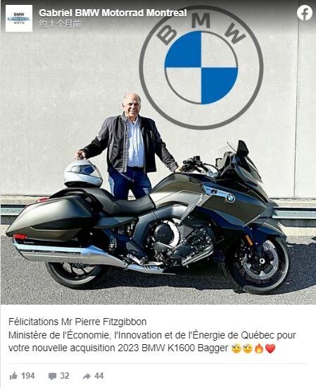 蒙特利尔宝马摩托车经销商7月12日在他的Facebook页面上留言称:“恭喜魁北克经济、创新和能源部的Pierre Fitzgibbon先生购买了新款的2023 BMW K 1600 Bagger。”