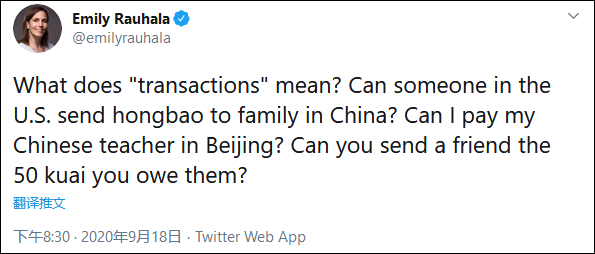 值得注意的是,对于美国商务部所提到的禁止有关“交易”,许多人依然不是十分理解。《华盛顿邮报》的记者艾米莉·劳哈拉(Emily Rauhala)就忍不住在推特上问道:“‘交易’是啥意思?在美国的某人能发红包给在中国的家人吗?我能打钱给我在北京的中文老师吗?你能把欠朋友的50块钱发给他们吗?”