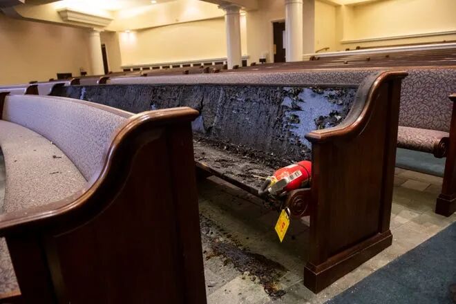 根据法庭消息,本次案件总共有四个涉案现场,其中包括教堂主堂和办公室等。万幸的是,主堂地毯使用的是防火材料,所以火势无法充分燃烧和扩散,所以主堂才能免于毁灭性灾难。