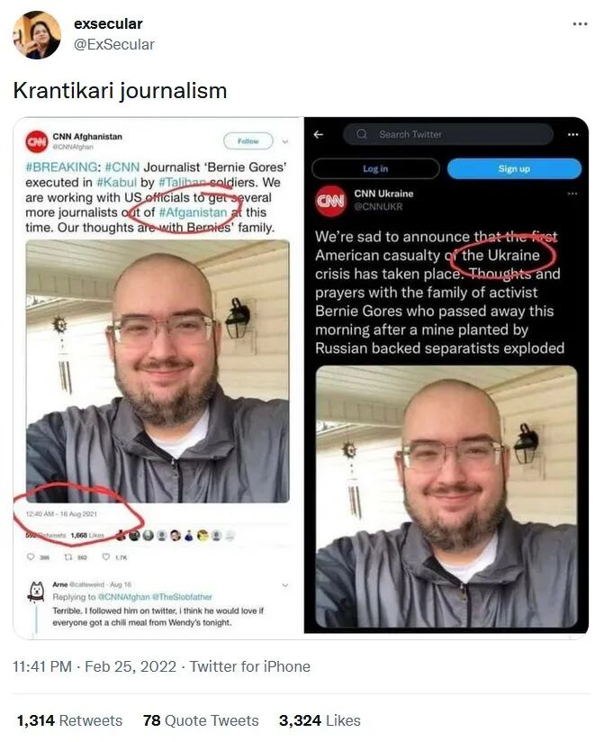 一段“乌克兰总统泽连斯基身穿军装,在前线军营中与乌克兰士兵喝咖啡”的视频,于上周末开始流传,并获得了近300万次浏览。视频描述上写道:“泽连斯基和战士们一起喝咖啡聊天,想象一下,这多么鼓舞士气啊,和一个国家的总统一起并肩战斗,他真了不起。”【真相】视频及照片都是真的,但拍摄时间是在俄乌开战之前。照片在希罗金拍摄,泽连斯基总统当时正在拜访前线士兵,以显示他对部队的支持。有消息称,一名CNN记者近日死于俄乌战火。但此事很快便被热心网友揭穿。2月26日,有网友在推特上发布截图并表示,“所传2月23日在乌克兰牺牲的CNN记者伯尼·戈尔斯(Bernie Gores),其实早在2021年8月16日的阿富汗就已牺牲过一回……一个人怎么可能在六个月之内去世两次?”更离谱的是,照片中的人根本不是所谓牺牲的CNN记者,实为YouTube博主、游戏主播乔迪·乔丹。可以理解的是,战争嘛,信息战、舆论战都是战,为了赢,人类无所不用其极。但小编同时想问,就算我们费事费力厘清了真伪,又有多少人真的在乎呢?