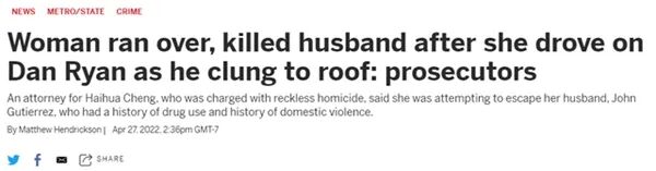 据芝加哥太阳时报报道,一名来自橡树林市(Oak Forest)的女性,不顾车顶紧抓旅行架丈夫的安危,将车驶上高速公路……停车后,他的丈夫从车顶落地,她再次开车,将丈夫碾压致死……本周一,27岁华裔女子Haihua Cheng(音:程海华)被伊利诺伊州警方拘留,面临“鲁莽杀人”和“未报告死亡事故”指控。