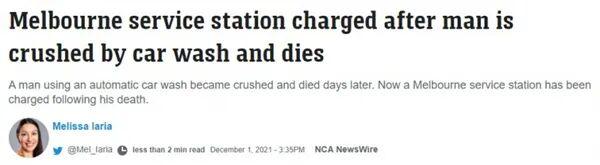 自助洗车机杀人事件,不是首次发生。2019年11月,澳洲墨尔本一名男子就死在自助洗车房内。据当地新闻报道,当年11月某日,一名73岁男子想在一家加油站的自住洗车房洗车。在洗车房门外,他下车去输入启动码(以开启洗车机),而就在该男子试图回到车上时,洗车机轨道突然启动。被车门带倒、未及起身的他,遭到了洗车机的碾压。在被送往医院后的第三天,该男子因伤势过重不幸身亡。之后,他的家人将加油站告上法庭。