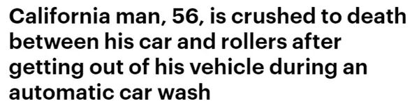 近日,美国一男子在自助洗车时,卡在洗车房机器里被活活碾死!