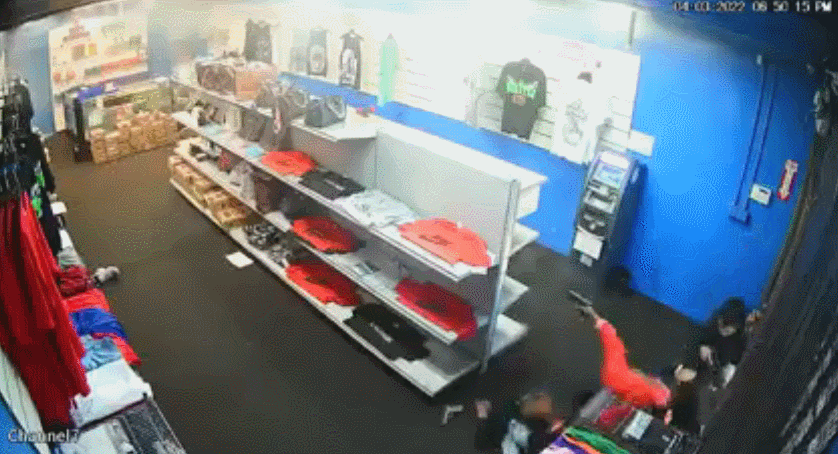 此刻,店员掏枪还击,导致四名劫匪无法起身打开店门。