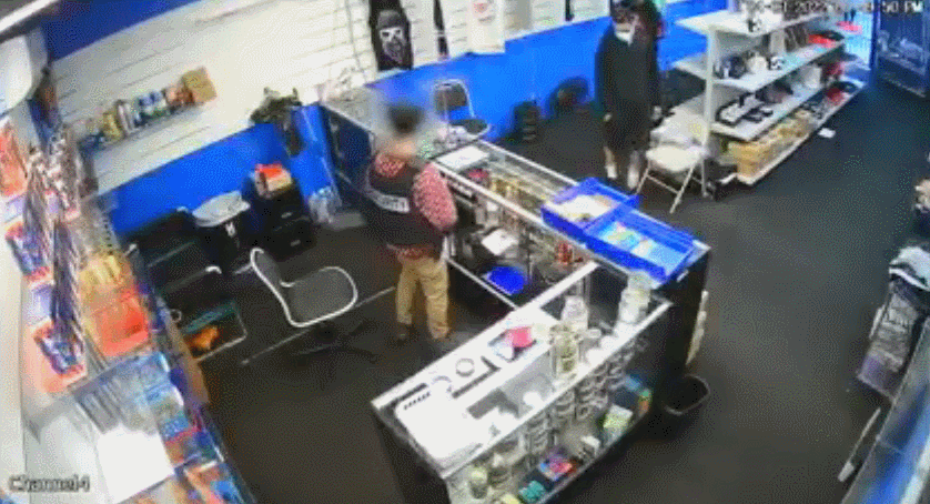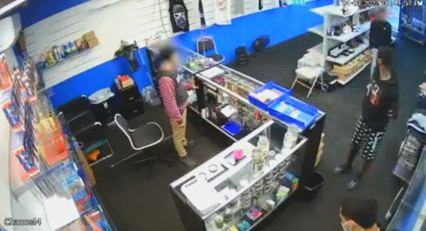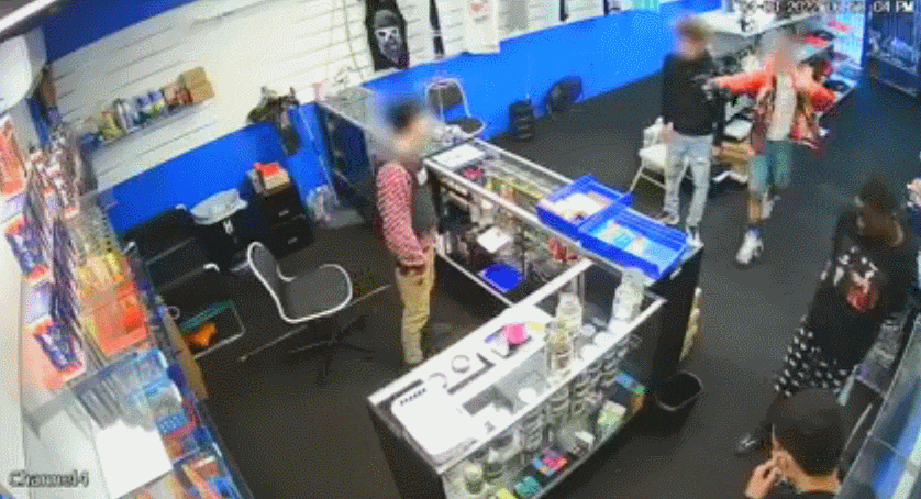 4月3日傍晚6点54分,4名男子陆续进入烟店(洛杉矶康普顿威明顿大街1500号)。看店的,是一名身穿保安字样背心的男性员工。