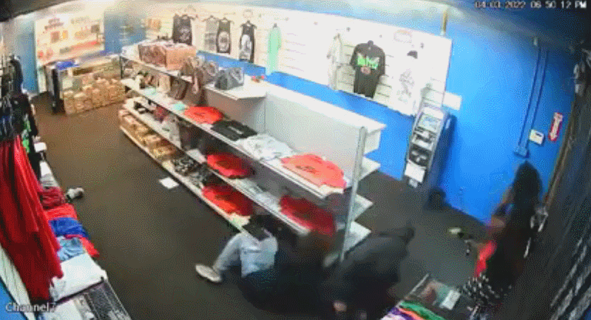 当日,四名持枪男子欲抢劫一家位于洛杉矶南部的烟店,店员掏枪还击,店内硝烟弥漫。混战后,一劫匪被当场打死,一劫匪被捕,两人在逃。店员身中数枪,但侥幸活命。