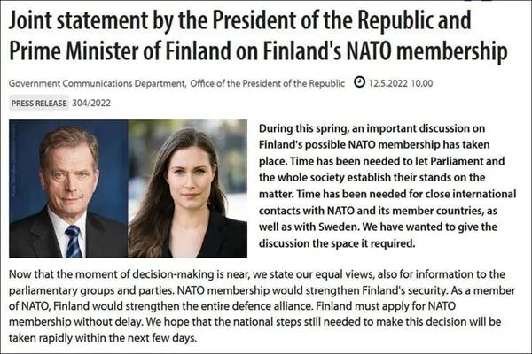 当地时间12日上午10时许,芬兰总统绍利·尼尼斯托和总理桑娜·马林发表联合声明,正式宣布支持芬兰申请加入北约。