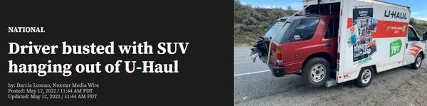 “我在路上见过很多不恰当固定货物的车辆,但哪次都没有上周日看到的那次那么夸张。”华盛顿州巡警约翰·布莱恩特(John Bryant)12日对媒体说:“一辆U-Haul的后箱中被塞进一辆SUV……只塞了一半,用根细绳勒着……”