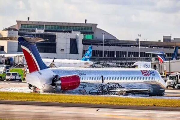 一架从多明尼加首都圣多明哥起飞的客机,于昨日下午17点38分迫降在迈阿密国际机场( Miami International Airport)。降落时,客机腹部着地,机身冲出跑道,撞损机场设施,起火并冒出黑烟。